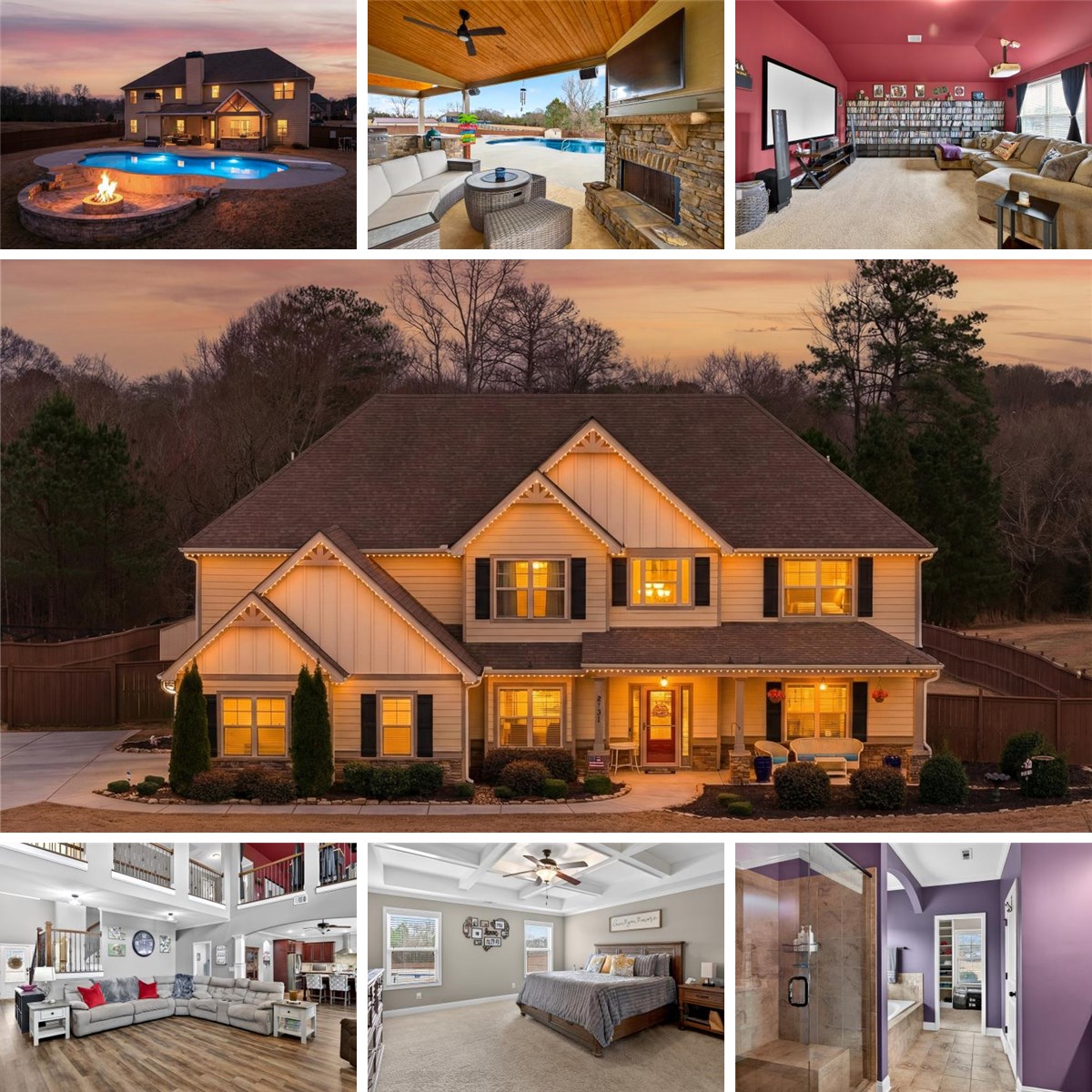 Five bedrooms, five acres, and less than 10 minutes to downtown Senoia. This property gives you space, privacy, and the kind of outdoor setup most homes simply don't have. Inside, the main living area features a true two-story ceiling with a stone fireplace and open sightlines into the kitchen. It feels open without being overwhelming and works well for both daily living and larger gatherings. The kitchen is built for function with granite countertops, stainless appliances, plenty of cabinet and pantry space, and a large island that serves as the focal point. It connects easily to the dining and living areas, making the layout practical and efficient. The primary suite is on the main level. The bathroom includes a tiled shower, soaking tub, and a layout that gives you space without wasted square footage. Additional bedrooms upstairs provide flexibility for family, guests, or home office use. One of the standout features is the dedicated movie and entertainment room. The projector and large screen remain with the home, so it's ready for movie nights, sports, or gaming from day one. Another unique feature is the permanent holiday lights installed on the front of the house. These lights add a significant amount of extra lighting to the front of the house and a custom holiday lighting package with dozens of combinations for every holiday throughout the year. The backyard is designed for actual use, not just looks. There is an in-ground pool with a lower patio with a built-in fire pit and seating wall, a covered back porch, an outdoor fireplace with a mounted TV, and an outdoor kitchen setup for grilling and hosting. The layout creates multiple gathering areas so larger groups aren't confined to one space. Whether it's a quiet evening by the fire pit or hosting a pool day, the space supports it. The five acres provide usable space and privacy. There's room to add a shop, garden, or simply enjoy the buffer from neighbors all while staying close to Senoia's restaurants, shops, and events. If you're looking for acreage, a master-on-main layout, and a backyard built for entertaining without giving up convenience to town, this home is it.